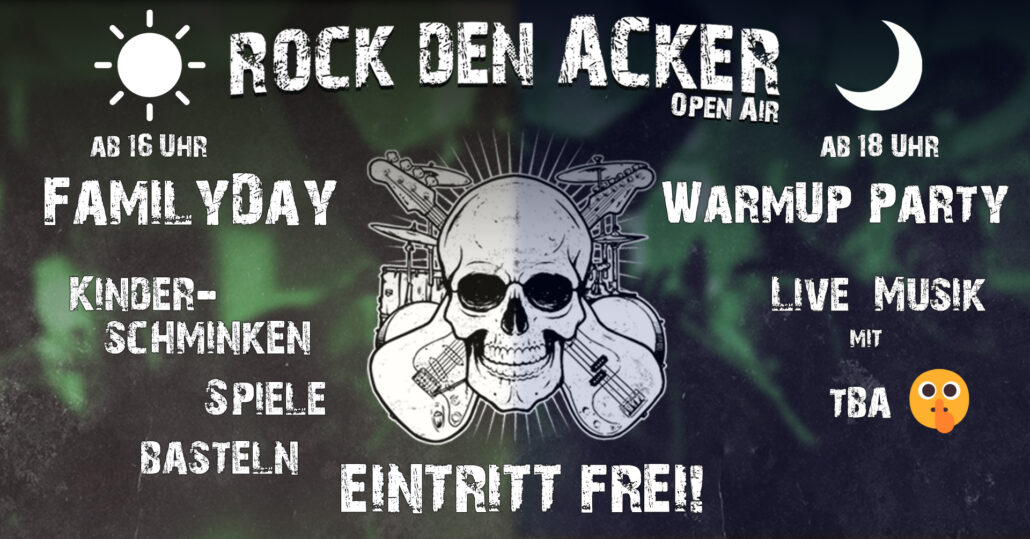 Am 14.05.2025 laden wir Euch erneut zum „Acker WarmUp“ ein, und zwar mit einem FamilyDay ab 16:00 Uhr mit reichlich Spaß für Groß und Klein und anschließender WarmUp Party!